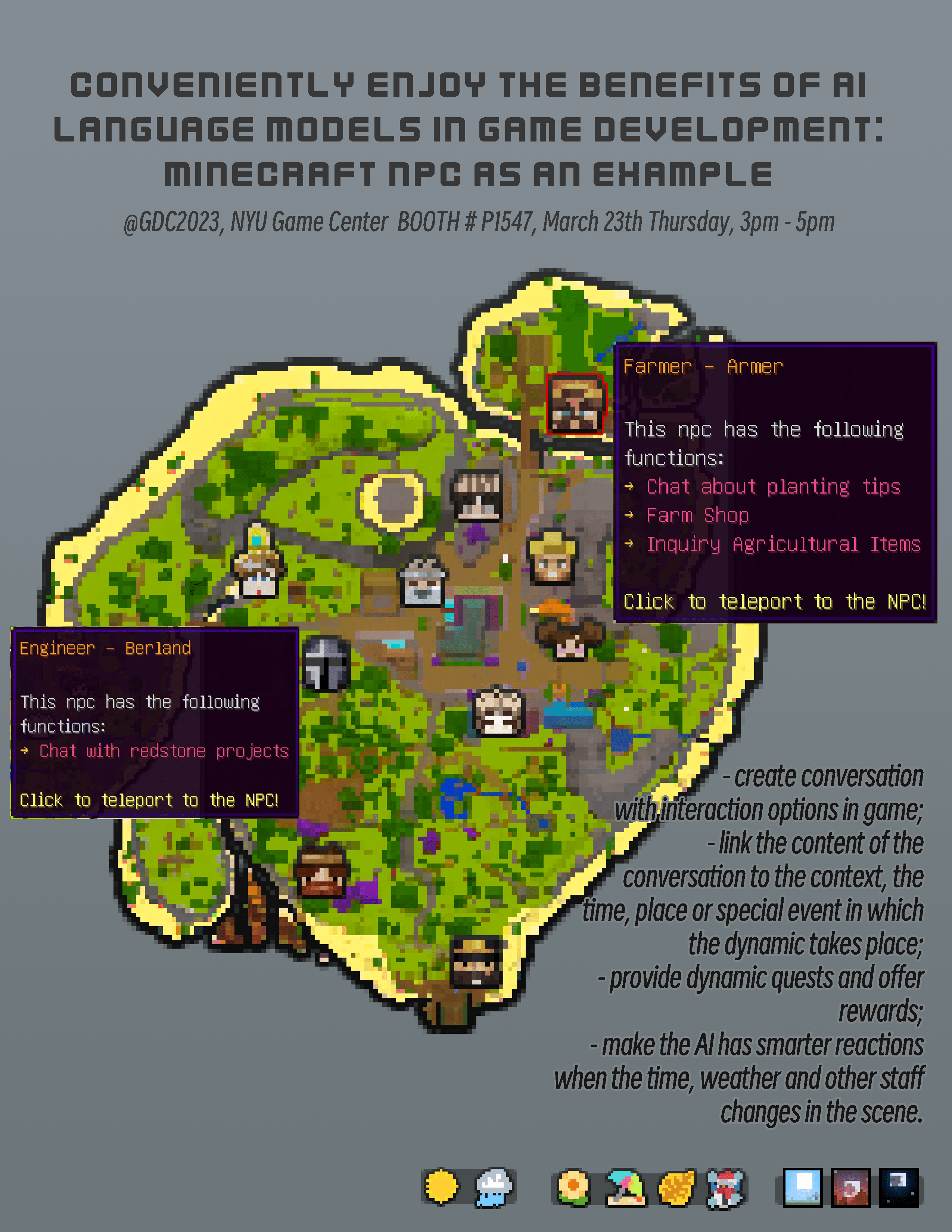 GptNPC是我最近设计和开发的一个自然语言模型应用原型。我在Minecraft中搭建了一个岛村场景,玩家可以自由地与所有岛民交谈、买卖物品、接受任务、查询信息。所有内容和动作均由 AI 动态生成,并受环境信息、NPC 和玩家状态的影响。