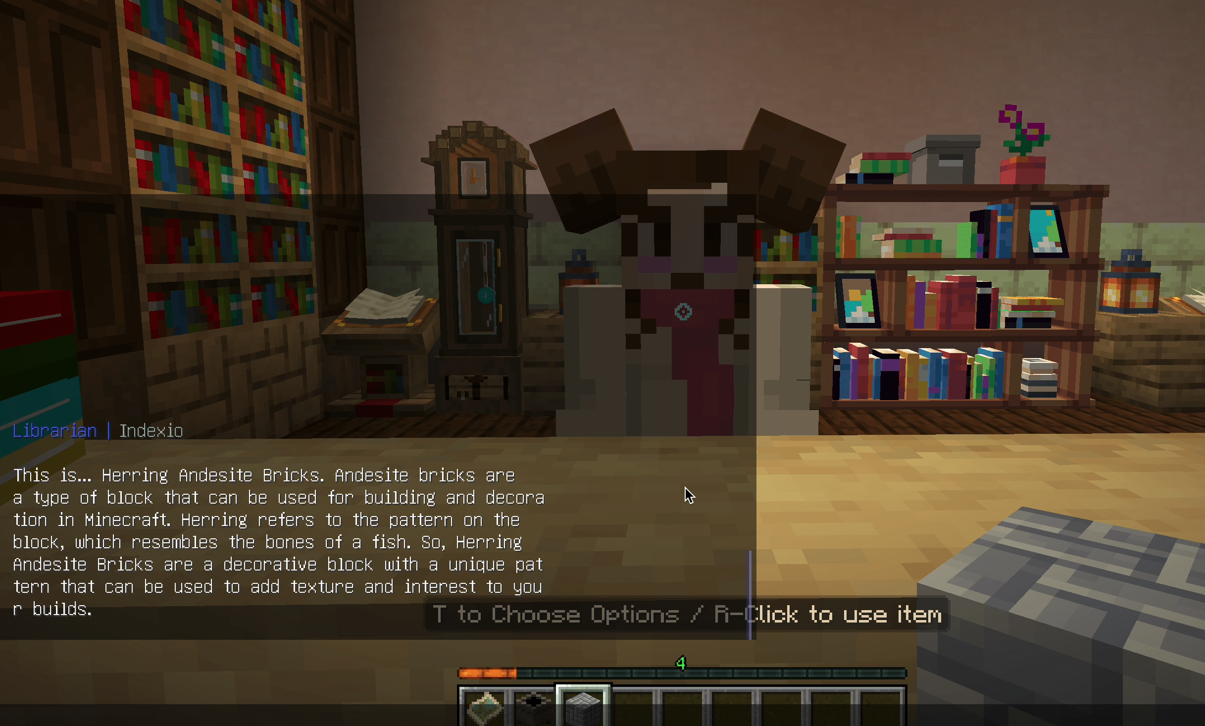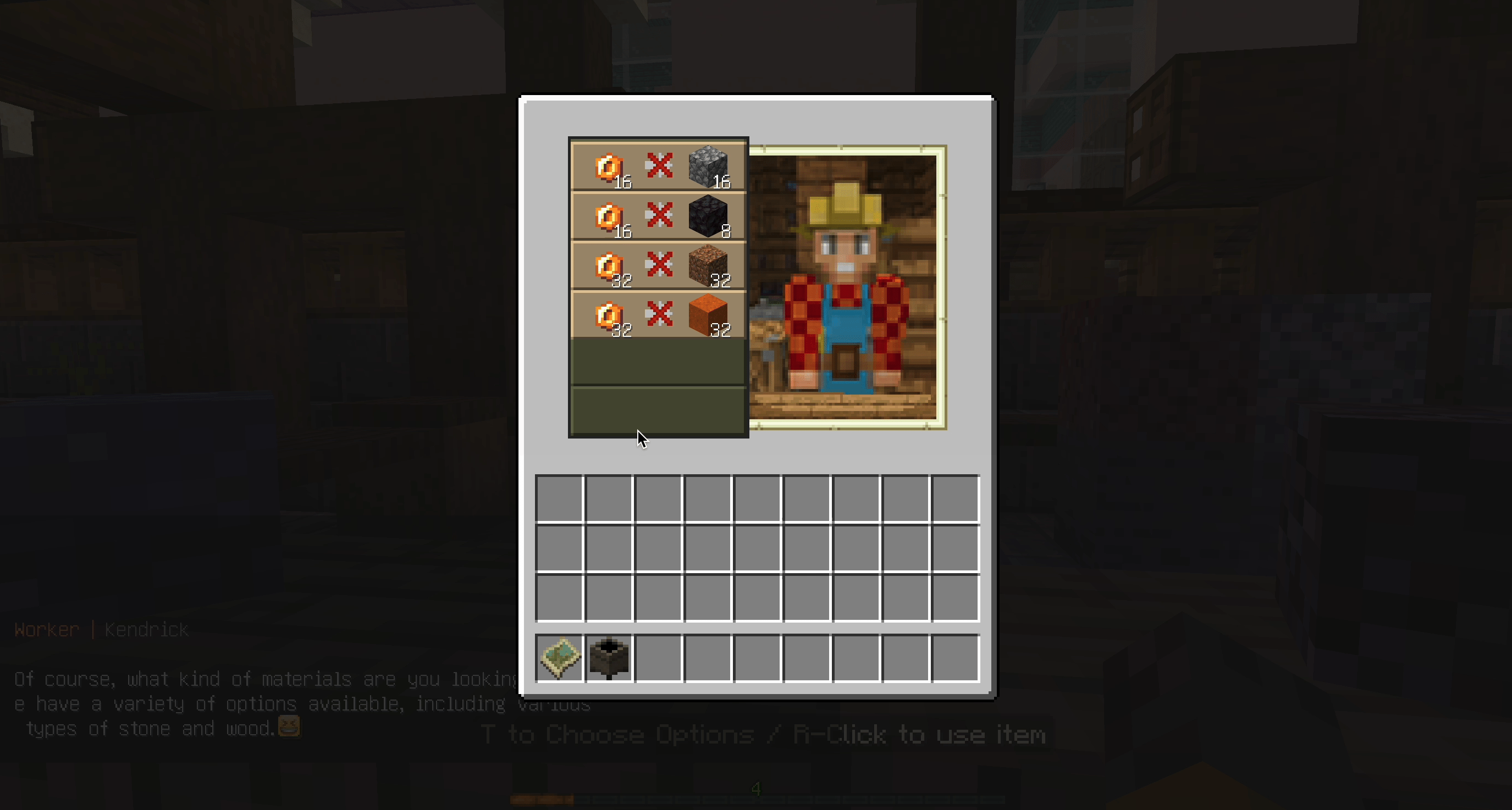 基于预先配置的物品清单,村民可以通过在对话中提及物品的买卖来设置商店物品清单,并打开商店的GUI,与玩家提供贸易。